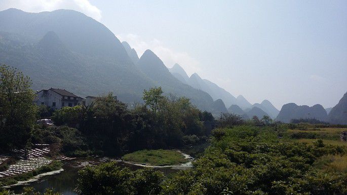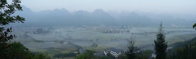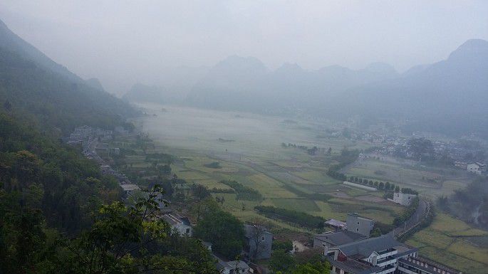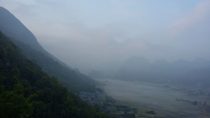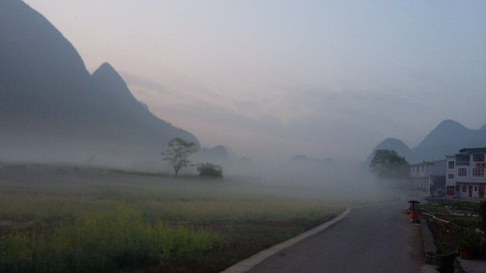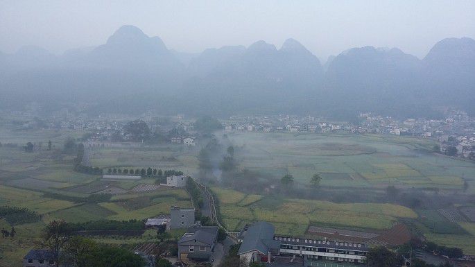 东北方向视野尽头渐渐起雾,峰林、田间、农房,完完全全的一幅纤尘不染的水墨画,伙伴们的尖叫把大地唤醒,同时也把我唤回到现实中。