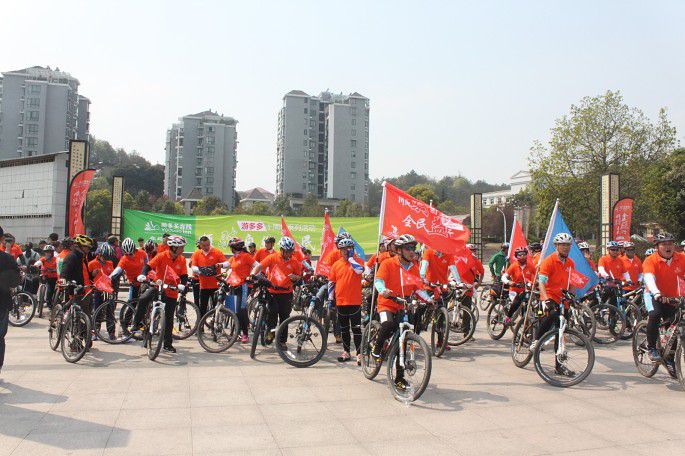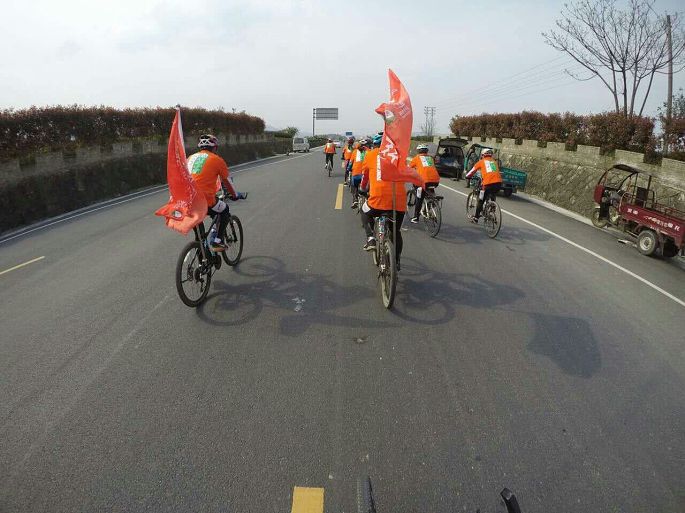 看一下广场,哇,满满的橙色,都是我们的骑行爱好者哦,大家检查了下车子,做了下热身活动,都开始摩拳擦掌起来了。随着动员讲话和松阳旅委许主任的一声发令枪响,100多辆自行车如同脱缰的野马一样冲出了松阳市政广场开始了正式的骑行。