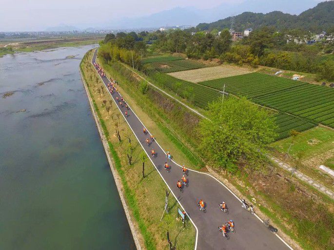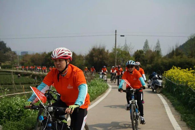 骑出不久就到达了松阴溪的绿色骑行道,松阴溪畔绿树成荫,远处山峦叠障,岸边随处可以看到小聚的三五好友,垂钓的悠闲老人,采茶的勤劳茶农,带着孩子举家出游的幸福家庭,好一派景象。当然当然不能不了我们100多位骑行达人的身影了,一路都能听到被家人带出来郊游小朋友们稚嫩的加油声,整个松阴溪畔的骑行道上都飘着一抹橙,和自然形成了鲜明的对比,成了当天一道靓丽的风景线,路人游客也纷纷掏出手机记录这一时刻,我想他们的朋友圈估计都被我们刷屏了吧。