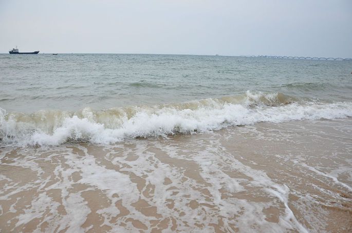 雾蒙蒙的天海一色,海平面上可以看到小小的渔船,还有远处的斜阳岛~等了一会儿,太阳终于露脸了!不过也就一会,云层实在太厚。。。沿着海岸线过去也能看到星星点点的游客驻足观景,也有游客直接穿泳装来晨泳的,海水不蓝但是很清净,不像石螺口海滩的水混着沙的浑浊~