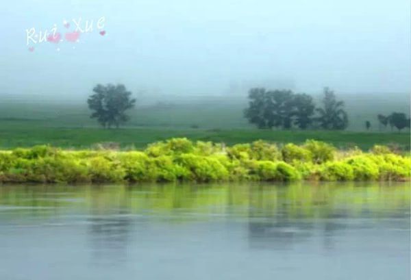 清晨的一抺阳光照耀在对面的俄罗斯河堤上,远山隐在雾中。缠缠绕绕的白云和弯弯曲曲的小河,仿佛一幅浓淡相宜的水墨画。