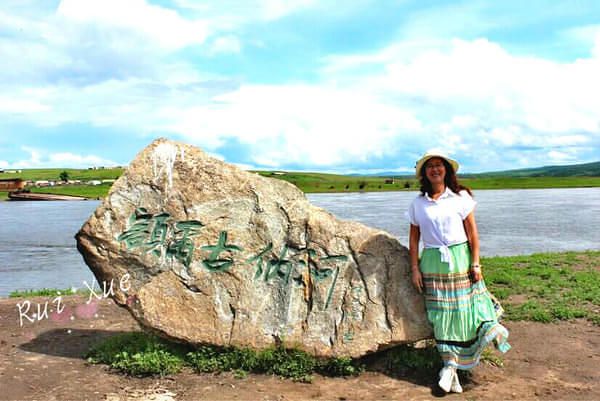 最让人惊奇的是这里并没有冰冷无情的铁丝网,更没有严格的“国界”的概念。河面并不宽阔,水流也比较平缓,水性好的人一个猛子扎下去就会游到对岸。嘿嘿,但是会被以“偷渡”为由送遣回到中国使馆,除罚款外还会被行政拘留。小超开玩笑说,如果你们愿意这样的话,也可以游过去哈。呵呵,怕成为“偷渡客”,我们可不敢哟! 在室韦信号不稳定,手机的网络已经被强大的俄罗斯信号所取代。我的手机里还时不时显示着俄罗斯的信号,以至于老公打我的电话都接收不到。他只好打通了梅妹妹的电话,并说我电话里讲的是外语。过了不久,我居然还收到了一条短信,提醒我们已经到了俄罗斯了,这是第一次感觉离国外那么近。赶紧关掉手机电源,要不然伤不起啊! 靠在尔古纳河额石碑旁 ,河的对岸就是俄罗斯。