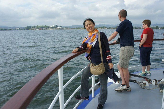 身处一派碧水蓝天、湖光山色之间,吃什么已经显得不太重要了。我随便吃了点东西,就离开船舱,在甲板上享受微风。天气虽不太好,多云,但湖水清澈,有多变的色彩,是个特别的早晨。