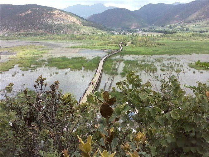 鞋子晾了一晚还是有点潮,两人又骑车上路啦~走婚桥是摩梭族人的“情人桥”,他们相信一同走过这桥的男女将永远幸福的在一起~桥就建在大草海上,郁郁葱葱的草海望不到头,一只只猪槽船在当中穿梭,很有味道!从此一路都是宽阔笔直的乡村大道,宁静得让人感觉纤尘不染,非常解脱安逸。我喜欢这样在蓝天白云的俯瞰下自由自在的骑行,像是可以骑到天上去!我沉醉其中 不能自拔。但BF貌似有些闷了,一路两人无话。。。过了滇川分界桥后不久风景又转为山路连绵,湖水清幽了,而且湖边玩的人也变的多些,却也累坏了骑车的人,爬坡、绕山、饥饿、口渴。。。还好偶见几个小卖部 或者小乡村的农家饭 都可以补给。