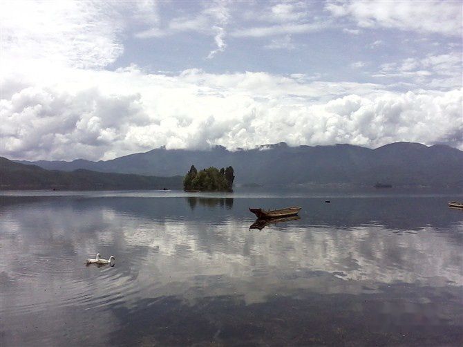 四川境内的泸沽湖很静很美,那水要比我们住着的里格前美多了!湖天互印 没有一丝人烟污染!忍不住把车骑到湖边泡下脚 甚至想跳进去游个痛快!就这么静静的 真是好享受~~~~接着吃了带着的干粮,不知从哪引来一只小小“田园犬”,也跟它分享了点吃的,谁想我们上路后就一直跟着了。不忍心看着它追得气喘吁吁 我们不是骑得很慢就是走走停停,还试着把它载车上可惜装不住。。。这样到了一个小村,把剩下的所有香肠喂给它我们就甩开这位半路遇上的朋友快速骑走了,那一刻,我看到BF不舍的回望 甚至眼中还有闪烁,也许像我这种从来没养过宠物的人是没法理解那种心情的吧。。。