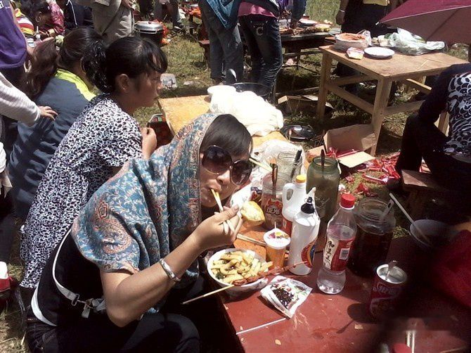 中午时分,人群都向毡房所在的大草坪处聚集,音乐响起,看到好多盛装的摩梭族男女拉起游客的手开始围成一圈又唱又跳,这种热闹我喜欢!于是两人也赶快飞奔下山,途中看到女神塔人少些 忍不住又跑去膜拜许愿转了三圈~~跑到大草坪,实在太热闹啦~歌舞圈满是人挤都挤不进,外围的小摊铺也是好多食客,差点跟BF挤散掉。忍不住淘起小摊铺来:看那挤满孩子的大篷子 芭比娃娃冲锋枪等等全是当年爱玩的玩具,这边一排卖的都是零食 有西瓜泡泡糖、猪油糖、唐僧肉、麻辣条等等都是当年爱吃的,最多的当属吃的啦,有烧烤、冰淇淋、米线凉粉,全都又正宗又便宜!忍不住在一家凉粉摊挤到长板凳的一角,要一碗特别乡野的鸡豆凉粉大快朵颐!还有BF买来的烤玉米烤土豆烤牛肉,全是当地最正的特产啦!身旁又换了一批食客,竟然是我们所住青旅的大厨及其朋友,互相分享美食,边吃边聊 不亦乐乎。