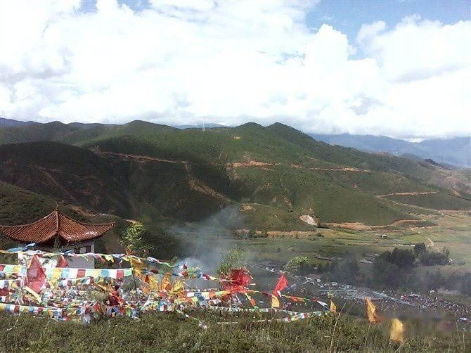 到了到了!山脚的小泥路停满了面包车和摩托车,我们算是到的晚的了。山坡上平坦的一大块草地已支起了两间毡房,周围是一些当地商人占据的位置,大汗淋漓的托运桌椅货物 张罗摊位生意。往上稍高处散落着盛装老太太烧柴架锅煮起酥油茶 那是一大家子人一同来膜拜神山来了。我们游人们也跟着摩梭族人的步伐一路往山上爬,巍峨的格姆女神山近在眼前。先到达一间小庙房,老少喇嘛们正在诵经,香客们则自然的跪拜在屋外,投递香火钱。山坡最高处是一座精致的小塔,摆放着女神神位,塔前有一个很大的焚烧炉,信徒们跪拜跟前 投烧香纸,喇嘛们帮助虔诚的摩梭族人在塔的周边挂满了经幡,在阳光下五彩斑斓 十分壮阔美丽!我们也学着摩梭族人一样,对着女神相跪拜祈福,围着小塔连转三圈,边转变嘴里念念有词“祝我的家人身体健康,祝我爱的人们都幸福快乐。。。”