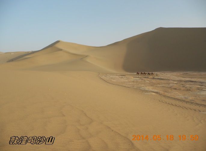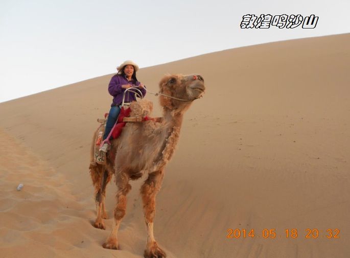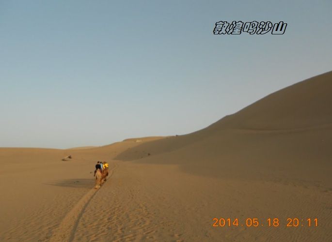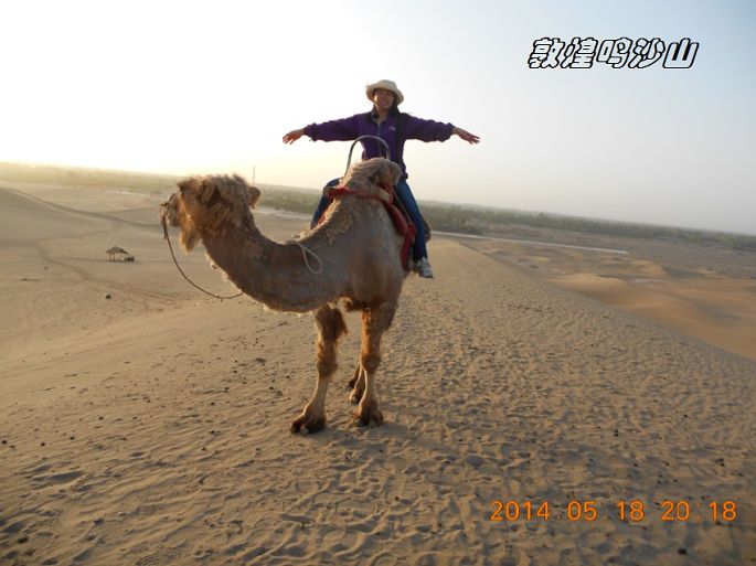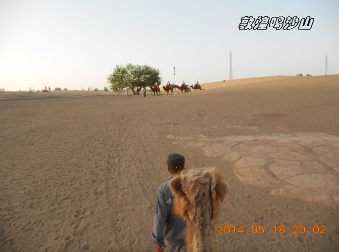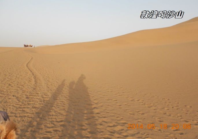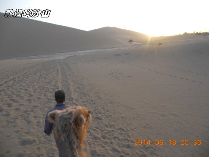 鸣沙山,因沙动成响而得名。沙漠骑骆驼要100元来回,大概也就半个小时左右,往鸣沙山上骑,下马处还不到山顶,如果要上山顶看日落,得另外交钱骑马上去,骆驼在那里等。当然如果你体力可以,也可以自己徒步上去。