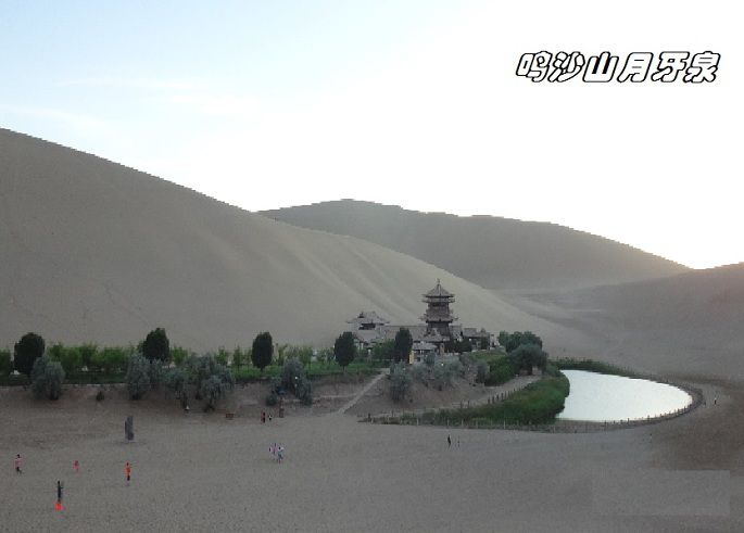 在鸣沙山群峰环绕的一块绿色盆地中,一泓碧水形如弯月,这就是月牙泉,被称为天下沙漠第一泉。历来水火不能相容,沙漠清泉难以共存,但是月牙泉就像一弯新月落在黄沙之中。泉水清凉澄明,味美甘甜,在沙山的怀抱中娴静地躺了几千年,虽常常受到狂风凶沙的袭击,却依然碧波荡漾,水声潺潺。而要想看月牙泉全景,得上对面的鸣沙山顶看才可以。下了骆驼,脱了鞋子便向鸣沙山顶奔去。