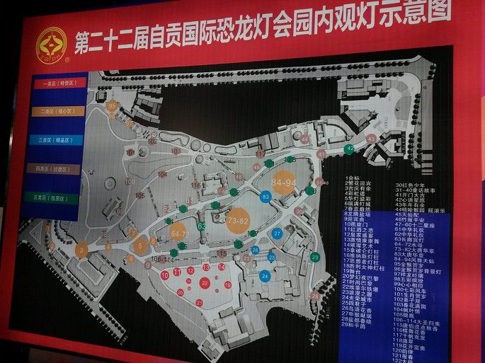 成都到自贡走成自泸高速,两小时就到了,进城吃了盐帮菜第一名菜:鲜锅兔,再把车放到免费停车场,坐自贡政府提供的免费直达观灯大巴车,就到了彩灯公园大门口。