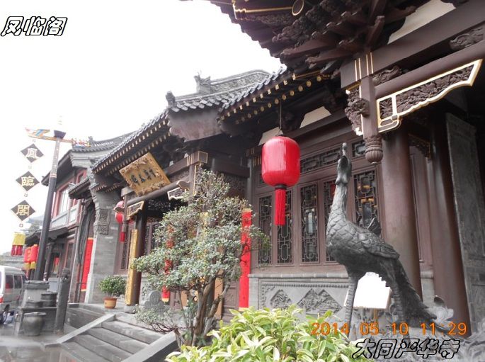 在华严寺,说起吃饭的地方,“风临阁”是每一位到大同旅游的必推荐游客去的地方。“凤临阁酒楼”坐落于千年古刹华严寺东侧,雄立于千年历史文脉的鼓楼东西街文化轴西端,主楼总建筑面积6000平方米,建筑飞檐斗拱、雕梁画栋,内部曲栏回廊、移步异景,汇聚了中国古代建筑的诸多样式和风格。据说“凤临阁酒楼”创始于明朝正德年间,迄今已有500年的发展历史,是历代名人雅士云集,美食家乐聚的地方。随着时代变迁,“凤临阁”早已不是当年的那个“凤临阁”,而今,“凤临阁酒楼”在经过10年的装修后富丽堂皇,这背后,据说装修费用就花了2亿多,其中有一套厕所是用50吨纯铜打造的,造价500万。