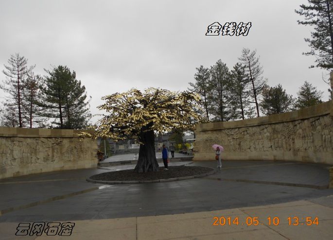 佛光大道的尽头是礼佛浮雕墙,正中央有一棵金灿灿的金钱树。