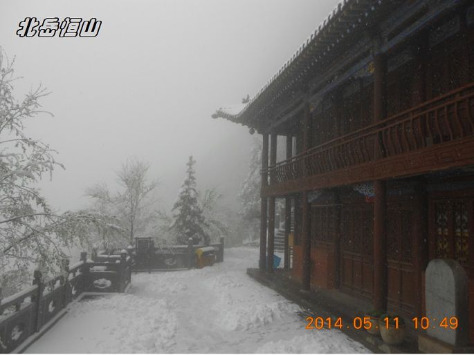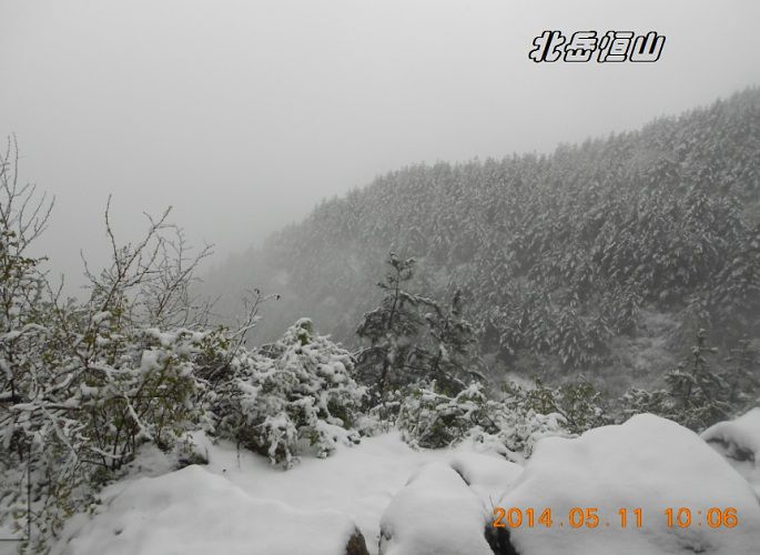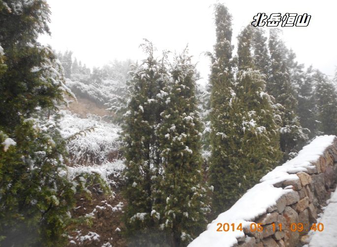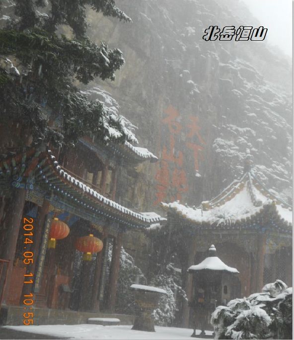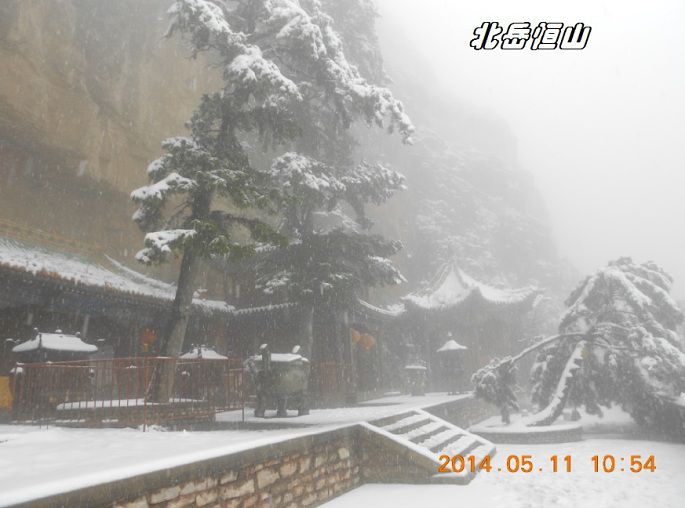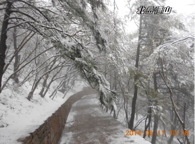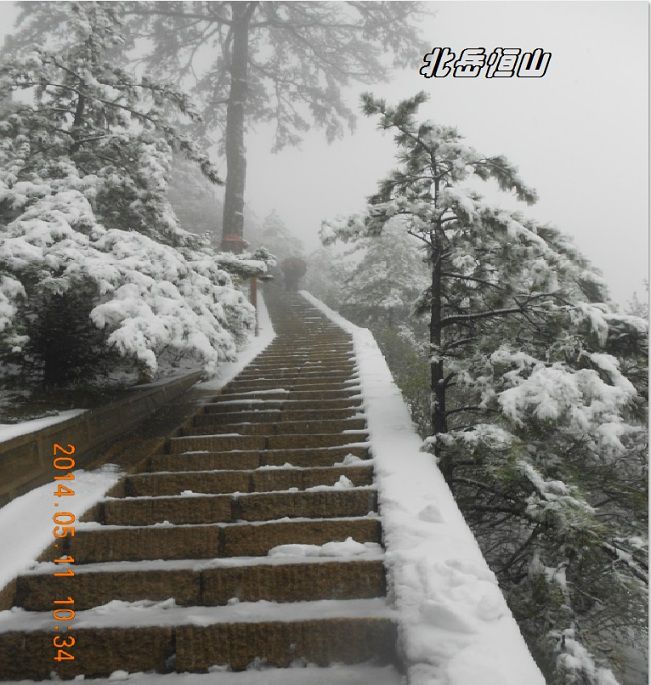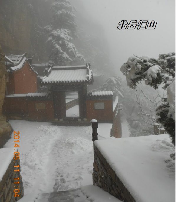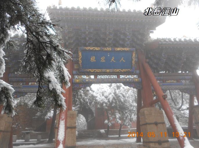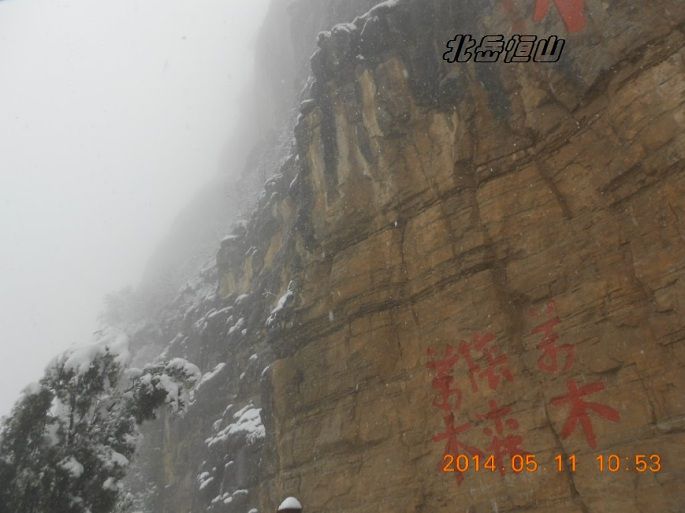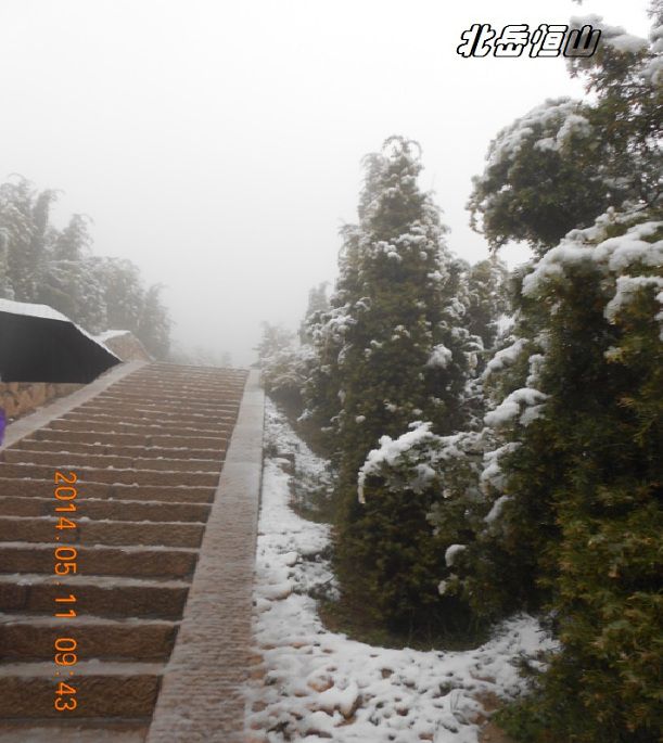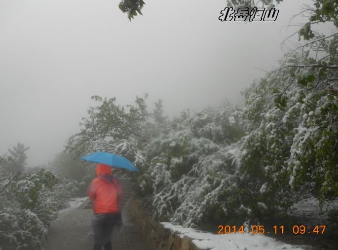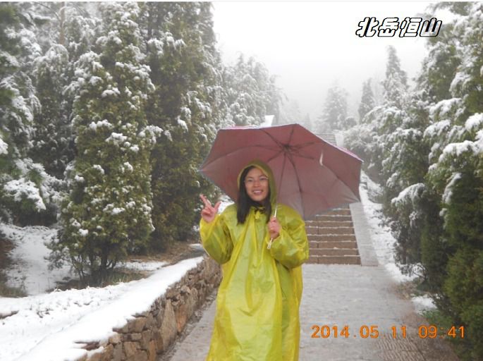 雨越下越大,九点钟左右终于到达恒山景区门口,恒山门票55元,这应该是五岳当中价格最低的了。恒山售票处距离真正上山的地方还有一段盘山路要走,如果是自驾或者包车前往,车子是可以开上去的,但需得另外给10块钱作为停车费。在售票处买了门票,坐上车继续往上开至登山石阶。下车,验票,验票员提醒说上山昨晚就已经开始下雪了,现在还在不停一下着,让我们小心上山。什么?下雪?我不听错吧?现在可是五月份了,竟然来个五月飞雪(谁有这么大的冤啊?!)。长这么大,除了2012年去九寨沟看了那么一下雪景之外,我这个南方长大的娃还没怎么看见过雪呢,所以除了惊讶之外,心里其实还是有些欢喜的。穿好雨衣,脚上也套上一个胶袋(所穿的是网状的运动鞋,容易被雨雪打湿,这样的天气,如果鞋子湿了那可是非常冰冷的,所以司机帮忙我们几个找了几个塑料胶袋,希望能顶用),打着伞,一行人便开始登山了。