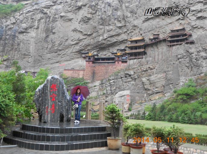 恒山到悬空寺只有1公里,二十分钟左右便到了。在悬空寺景区口下车,此时天空只是飘着细雨,与刚才在恒山山上截然不同,真是一个天上一个地下!
