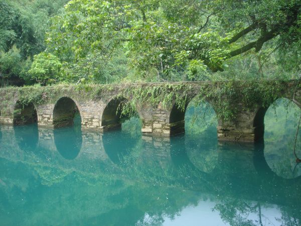 早饭23元,买的蒸饺匆忙到车站,乘坐6:44的K828火车(晚点半小时左右)63元,12:45分到麻尾,下着蒙蒙细雨,偌大的火车站广场除了乘客和几辆等客人的三轮车再无多余的人,史上最清净的车站广场。上了三轮车10元到麻尾汽车站,坐麻尾---荔波的班车,17元/人,到小七孔东门的王蒙街下车。13:20发车,15:00到王蒙。入住鑫梦宾馆,100元/标间,然后吃午饭,二肉一素一汤95元。吃饭期间下起大雨,等我们吃过饭,雨过天晴,太阳公公又出来了。出门向右步行三分钟就到大七孔桥。出门向左步行三分钟就到王蒙大桥。桥下碧绿的河水缓缓流淌,河岸上高大的翠竹摇曳,硕大的芭蕉叶伸展着腰身,看着甚是舒爽,下河边溜达溜达。晚上吃的各种串,先轻微油炸一下,再火烤。天然的野酸梅酿的冰镇酸梅汤5元一杯,共计64元。购买一些明天在景区的干粮。