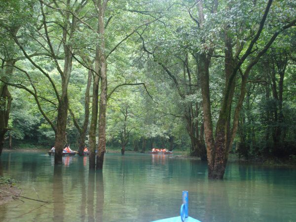 早上吃的包子,油条,喝的稀饭34元。行李就放在宾馆里,老板开车把我们送到景区东门口。门票110元/人,孩子免费,景区交通车40元/ren,景点战线拉的很长滴。住在王蒙的好处就是,早上我们很悠闲地用过早餐来到景区,不到8点就坐上了景区车。小七孔的美和九寨有些神似,只是每一个景点比较小家碧玉。水上森林是大家最为亲水的地方,每一个人都是笑声朗朗传向远方。最后一个景点是鸳鸯湖,一个天然的水网组成的迷宫。水面迂回交合,水边树木参天,空气出奇的好,40元/人,划船最为别致意外的地方。出来东门就有小面包车到荔波,9元/人,14:30出发,路过王蒙取行李,15:15到荔波。15:30坐荔波----三都的班车22元/人,18:15到三都,落脚汽车站出来左手路口向下走30米的深圳路上的帝豪宾馆,安顿好后,打听到对面的“水乡人餐馆”本地人常吃的,经过我们的鉴定,果然物美价廉,三肉一素一汤才71元,我们摸着滚圆的肚子回去。