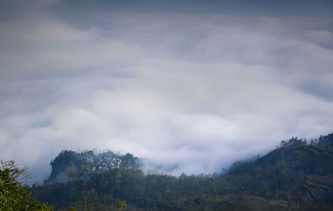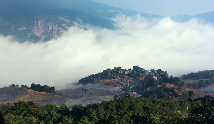 3)联办厂:拍完爱春,继续往前走一段路,就到了这里。这个地方是拍云海的好地方,云海里面的小村庄若隐若现,非常漂亮。这个拍摄点有点难找,是在路边的一条不起眼的的小路走到林子里大约200米的地方。当地的司机一般都知道,如果你看到有小面的停在一个四周什么也没有的路边,可能就是这里了。很多司机都会带游客走进去的。