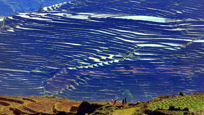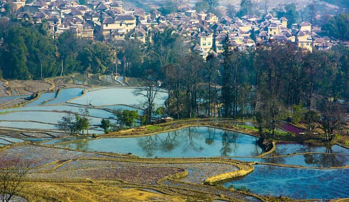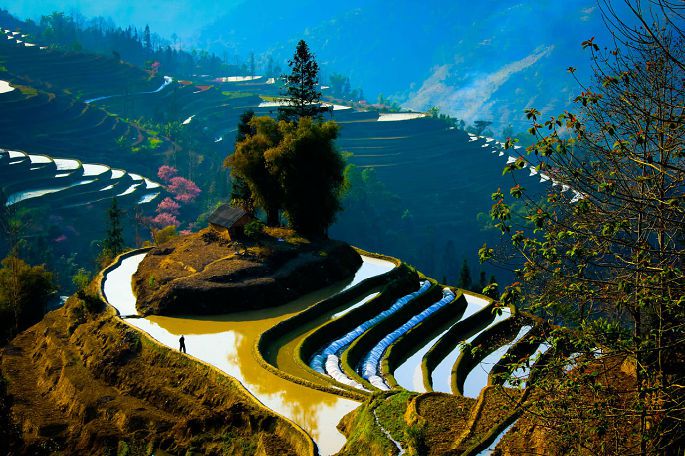 2)爱春:从多依树的观景台往里走大概4-5公里左右就到了爱春。这里是拍摄蓝梯田的地方。其实蓝梯田哪里都可以拍,但是你必须在合适的光线下,顺光,而且你和梯田的角度不能太大。爱春恰好就在路边,你可以下到梯田里去拍摄,所以梯田非常蓝。你拍完多依树以后最应该先到爱春,在一月份,上午9点左右这段时间梯田是最蓝的。