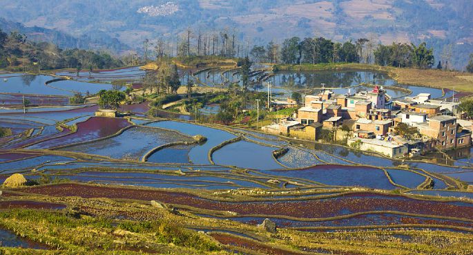 10)龙树坝:龙树坝是一个很美丽的彝族寨子,只有50几户人家。寨子被梯田包围着,上午可以拍到蓝梯田和红梯田,傍晚可以拍日落。从新街走路过去会遇到两条路,如果你是去村子里住就走下面一条,如果只是去拍照最好走上面一条。在2公里路牌那里有一个很窄的,放牛的走的路,这条路我走过一次,是比较近的一条,但是很不好走,一路都是在草丛里穿行,如果碰上一头牛还挺吓人的。如果不走这条牛路,则在2公里牌那里继续往前,大概200米左右吧,会看到一片竹林,透过林子可以看到美丽的龙树坝村,过了竹林有一条小路下去梯田。这条路也不是很好走,有几个地方还有点危险,最好用三脚架当手杖,多一个支点还是很管用的。走这条路要仔细辨认哪里是村民走出来的小路,沿着这条小路走下去几层梯田就可以看到一片豁然开朗的地方,那里有一片比较大的空地,都是摄影的人脚踩出来的,这里就是最好的地方。