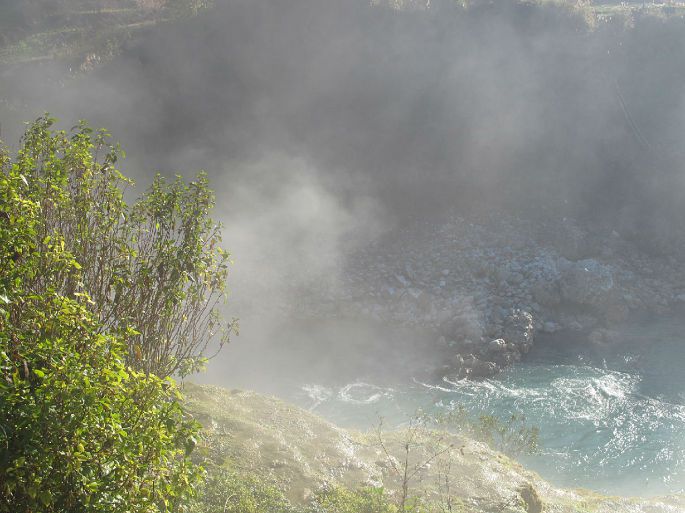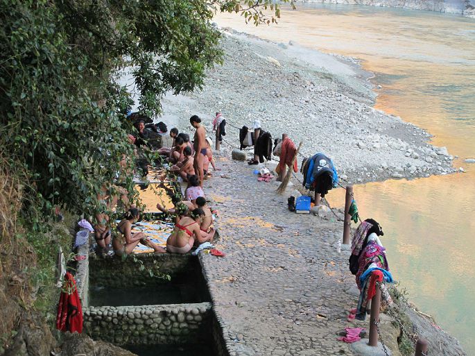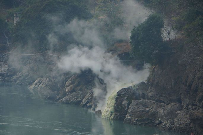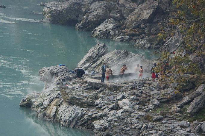 戴师傅8:45来接我们出发,走228省道,柏油路的路面路况不错。9:12来到怒江边傈僳族的“澡堂会”,从路边的小路下到怒江边,远看江边的温泉热气腾腾,尽管早上的气温才有几度但已经有傈僳人在温泉澡池中了