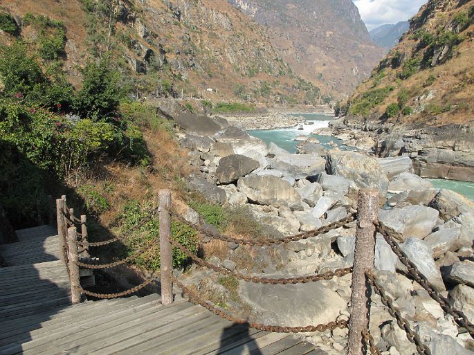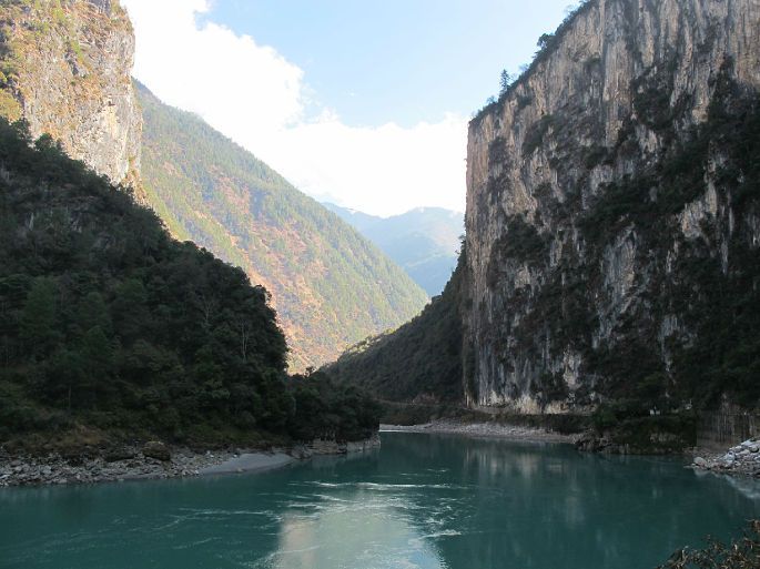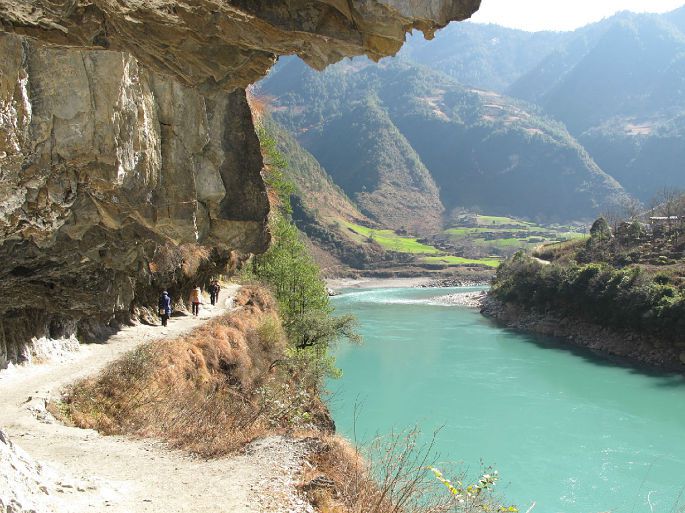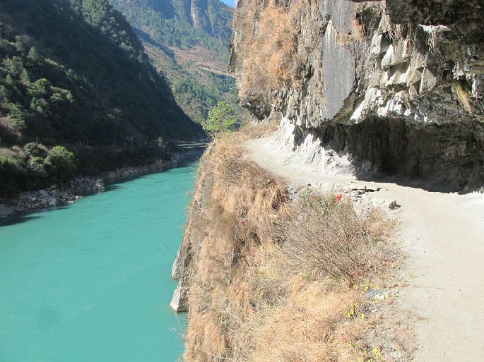 我们只是停留15min又继续赶路。车在怒江大峡谷里穿行,低头看碧绿湛蓝的怒江水—养眼,抬头观两山险峻之势—震撼。10:25到达距六库50公里处的腊玛登景区。“腊玛登”傈僳语,即老虎跳峡谷之意,被视为傈僳族的虎氏族发源地。在228省道右旁的观景台开始有一条沿着江边逆江而上的观景小道可供人们游览