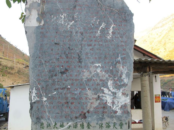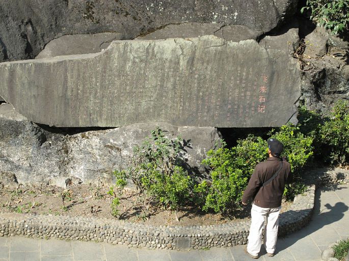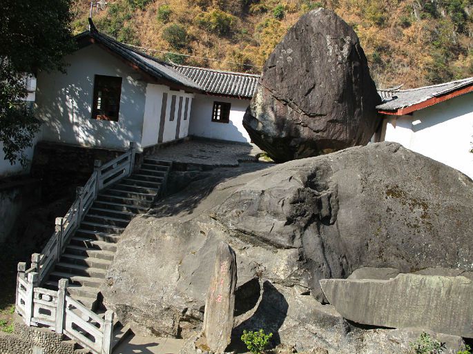 11:11离开“腊玛登”景区不久就过福贡大桥,这里开始是福贡县的地盘,车在怒江的左边行驶,11:49来到228省道边的飞来石景区,石头上记载:1983年3月19日凌晨2时30分,一块巨石悄然飞至,傲然屹立于一块近80平方米的扁石上。当时,磐石上建有一幢民族中学三合小院校舍,巨石飞落于院中,除北边小平房屋檐与飞石紧靠稍有损坏外,周围建筑毫发无损。