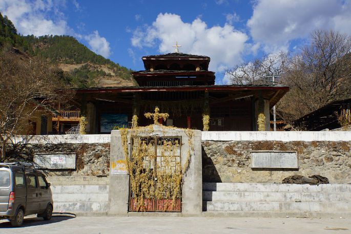 11:00在丙中洛乡镇府旁的小吃店早中餐一起吃,5人吃了50元的米线后出发。经佛塔、重丁村天主教堂、玛尼堆13:39来到位于丙中洛乡政府北上3公里的石门关--怒江两岸的大理石岩形成门一样的临江绝壁,紧紧闭住怒江,使怒江江面仅有20米