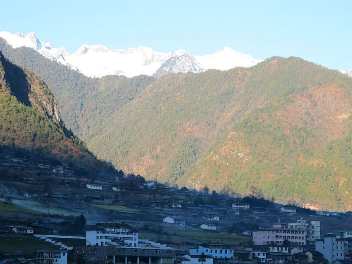 早7:30起床,8:00在丙中洛汽车站对面的阿怒小吃店吃早餐(55元/5人),抬头惊见日照金山