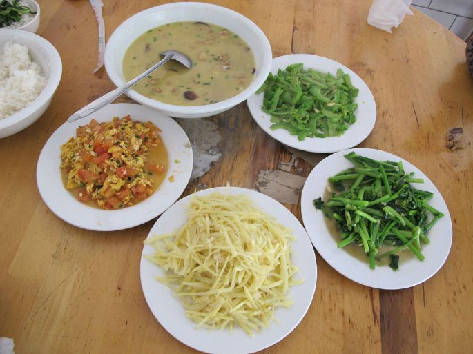 经看房问价比较我们选择住南江宾馆(0886-3636636),标间50元/间,天色已晚,因飞机的晚点耽误已经没时间去六库老城区逛逛,放好行李出宾馆门口向左走不远过马路就有一家味鲜小吃店,干净、价格和味道都不错,素菜10-15元、荤菜20-25元,我们4人晚餐共花了70元,老板还热情向我们介绍附近的圣恩堂做礼拜情况。
