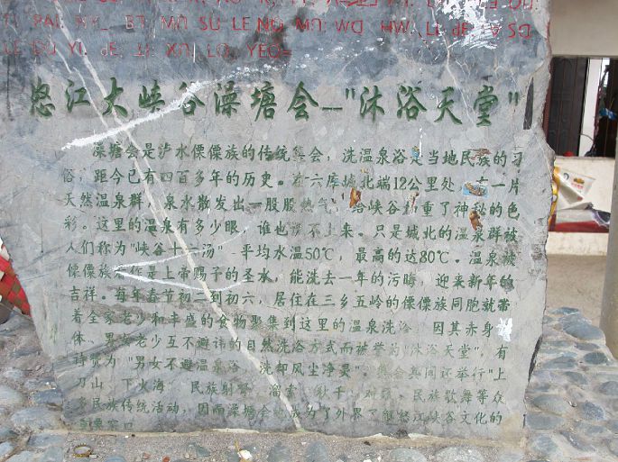 戴师傅说托人帮我们买好明天8点去腾冲的车票(66元/人),我们也给南江宾馆老板电话订今晚的住宿,这样我们就有足够的时间到”澡堂会”泡温泉了。17:30到”澡堂会”发现人比前天多了很多,完全是一个小集市,温泉的池子不大但人很多只能泡泡脚了。