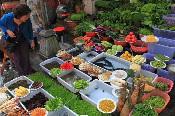 古城的饭馆都把蔬菜原料摆在门口,真是一道靓丽风景。