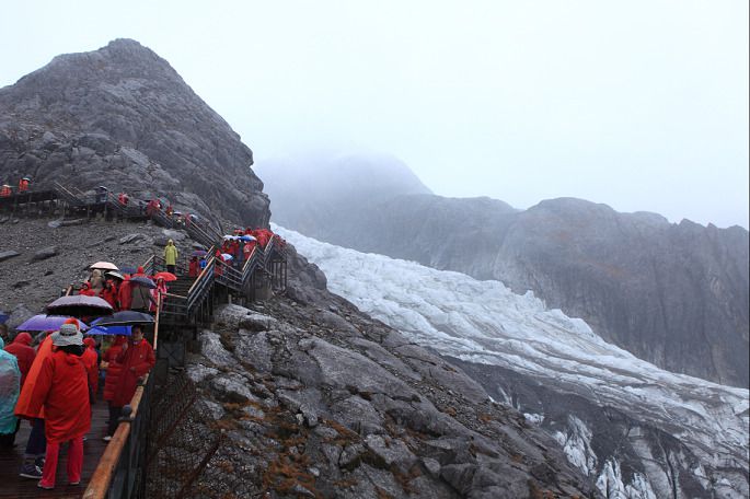 就在我们排队等索道下山时,突然云开,汹涌而下的冰川赫然现身,我们冲出队伍又去拍照。