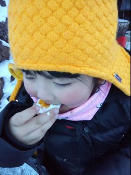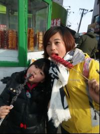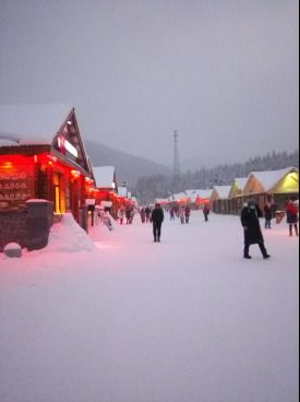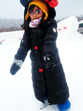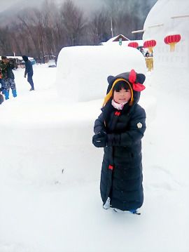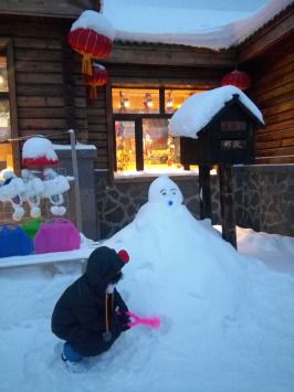 傍晚时分,我们到了雪乡,我和姐姐还有阿姨们今天可以住一个房间,一个无敌大炕,我好开心啊,吃完饭,大街上溜达一圈,我们来的时候还早,没有到最冷的时候,雪乡的雪还没有下足,大家照片里看到的那种最漂亮的蘑菇雪房子还没出现呢,不过打了灯光还是很好看滴,每家每户门口都有一个不同的雪人呢,街上马拉车,狗拉车,卖冰糖葫芦的,卖冻水果的,卖番薯,卖玉米,卖烤红肠的,卖冰棍的好热闹啊。麻麻给我买了冻柿子很甜很甜呢。好吃好吃