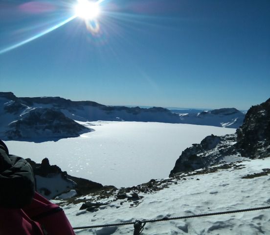 今天我们要上长白山了,在家的时候我就听过很多关于长白山的故事,特别是天池呢,说它是天上仙女们经常下来游玩的一个地方,好想看看到底有多美,在车上摄像赵叔叔又开始打开他的百事通,告诉我们长白山其实是个活火山,天池是火山喷发后形成的。现在长白山上还有80多度的温泉留出,山上有温泉鸡蛋,玉米可以卖。山上有好多的火山石可以捡,我还捡了两块送给老师,以后给我们班里的小朋友讲火山故事时当道具呢。我们上山的时候运气超好的,天气晴朗,没有雾气,而且温度也不低。天池整个都结冰了,就像一个巨大的镜子镶嵌在黑色的山脉中,用麻麻的话说,东北的山水太霸气!