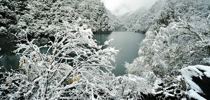 冬天的长海是最美的,百丈悬崖尽结冰,每一株树木花草都是一尊晶莹的雕塑,整个海子更成了一片冰晶玉洁的童话世界。