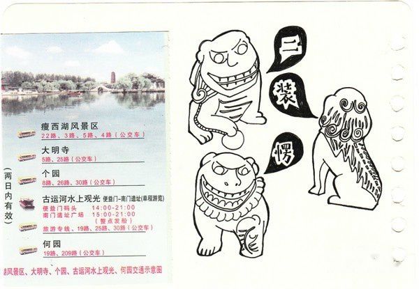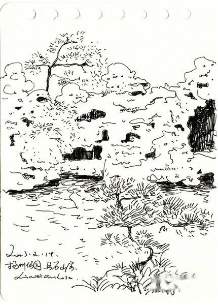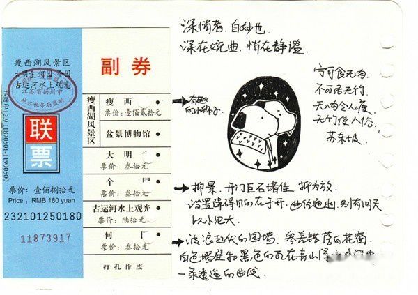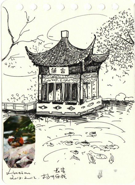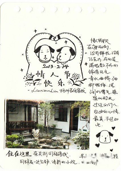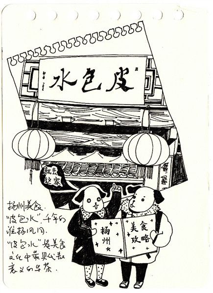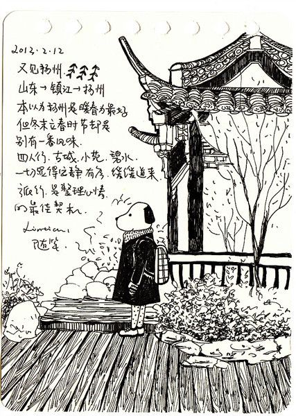 手绘有的是在途中匆忙画的,可以看出字迹很潦草,有的是回来以后看着照片细细整理的,画了三十几页仍然觉得有画不完的故事,回忆不尽的画面。在这个冷暖飘 忽不定的早春二月,赏心悦目的淮扬菜,风格清新雅致的小园林,水墨画一般诗情画意的瘦西湖,已经如同一幅幅胶片摄影影象在我们的脑海里。如果再给我们三天 假期,我们还会选择来到这座美丽的小城,细细品味独属于她的一个一个春夏秋冬。
