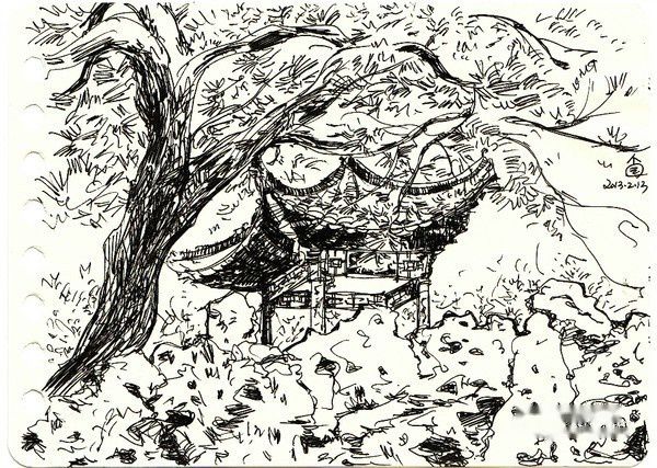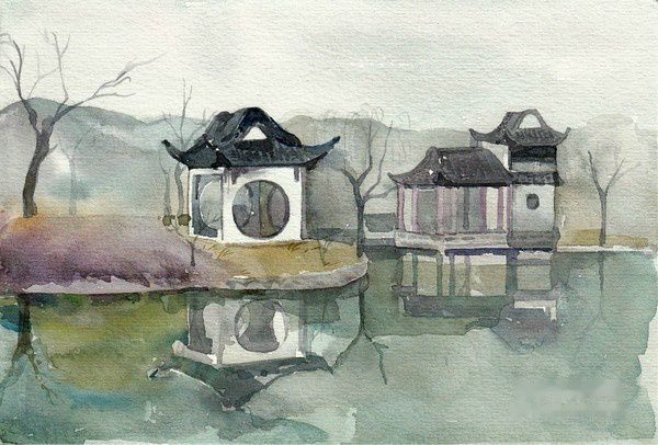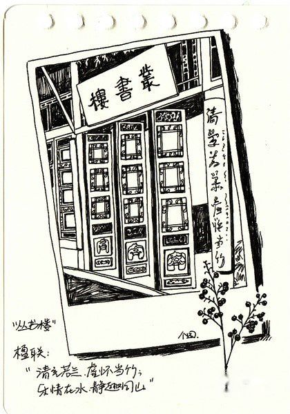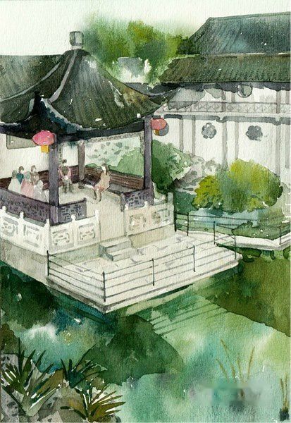 水彩小画,后面的匾额写的是壶天自春。