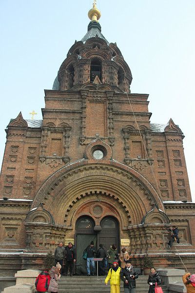 我们下榻的地方就在中央大街附近,于是放下行李后,我们就出门逛起了这条哈尔滨极具标志性的步行街。在中央大街,你一定不会忽略那些矗立在路中央的栩栩如生的冰雕们。但其实,真正体现这条商业步行街甚至是哈尔滨整个城市风格的,却是路两边的那些具有欧洲风情的欧式建筑:马迭尔宾馆,教育书店。。。沿着中央大街一路走到底,看过防洪纪念塔,时间也到了正午,肚子开始咕咕叫,恩,找个地儿先填饱肚子吧