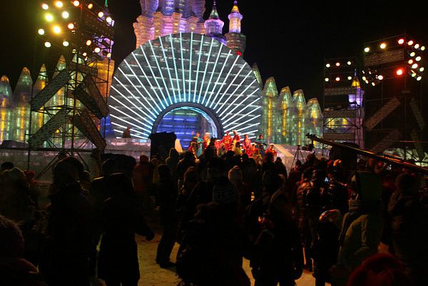 我们还意外地碰上某电视台在冰雪大世界现场录制春节晚会,一群穿的红红火火的大叔大婶儿在冰雪搭建的台上热火朝天的扭秧歌,果断围观~