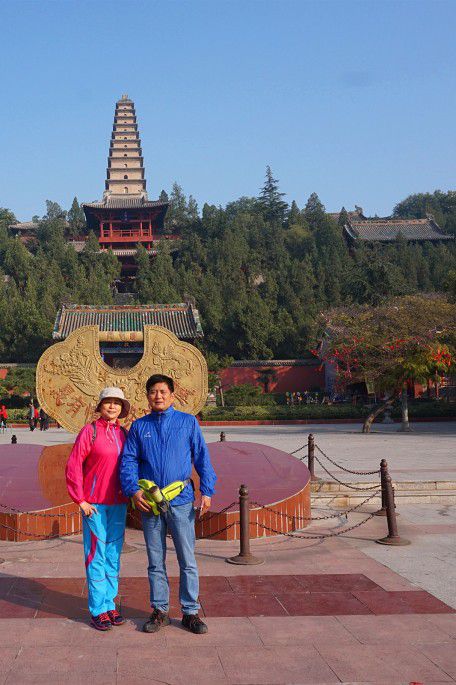 “ 待月西厢下,迎风户半开。隔墙花影动,疑是玉人来。”咏诵着这首千古绝唱,重温《西厢记》爱情故事。兴奋之余,我们来到寺前广场,观赏那个引人注目的同心大锁。一面书“愿有情人终成眷属”,另一面书“永结同心”。呵呵,老夫老妻也在同心锁前合影,永结同心,以此存照。