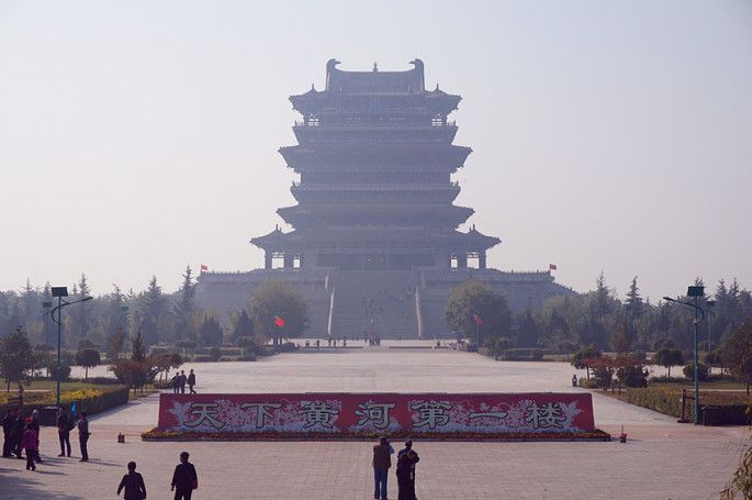 鹳雀楼是山西永济的著名景观,位于蒲州古城西面的黄河东岸。它与黄鹤楼、岳阳楼、滕王阁一起被誉为我国古代四大名楼。它始建于北周,毁于金元战火。“白日依山尽,黄河入海流。欲穷千里目,更上一层楼。”因了这首五言绝句,鹳雀楼熟稔于每一个学童的记忆中,登楼穷目千里便是一种念想。2002年新鹳雀楼复建落成,目前是国内唯一采用唐代彩画艺术恢复的唐代建筑,古典风雅,气势宏大。我们浏览了一层二层,便乘电梯直登六楼,想感受感受居高临下,雄观大河的气势。可是,可是我还只是远远的看到一条黄色的河,可能因为是枯水季节,水面不宽,无法下瞰,只能远眺。