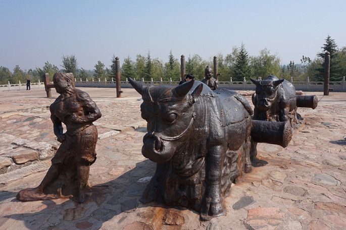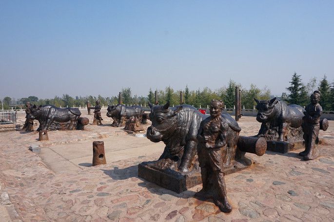 上世纪八、九十年代,在蒲津渡遗址勘查发掘出土了蒲津桥遗物。今天所看到的展出,是把铁牛、铁人、铁柱从原地提升12.2米,在地表以上恢复原貌,露天陈列。四尊铁牛威武雄壮,气势磅礴;每一尊铁牛旁都有一牵牛铁人,其造型精美,栩栩如生。解说是分别代表四个民族:维、蒙、藏、汉,我是没辨出区别来。据我们游览车的司机说:原先河西岸的两组铁牛、铁人,现已在河东岸山西界内地下,由于归属问题尚未挖掘。呵呵,明白了什么叫三十年河东,三十年河西哟。