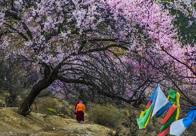 如果说到桃花,内地遍地都是,要说是西藏的桃花,估计很多人就不了解了,于是有人对我说:到西藏看桃花那不是吃饱了撑的吗?如果你真正看到过西藏的野生桃树,你就不会发出这样疑惑的声音了。先看看西藏桃树有多大吧,真可以说是遮天蔽日,树大根深,有的一棵树干得两人抱,见过这么汉子般的柔情桃花么?