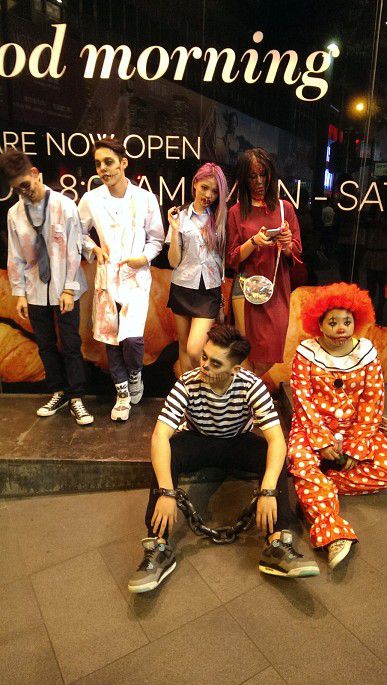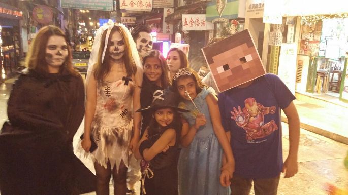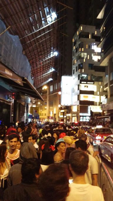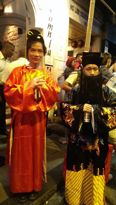 然后坐大巴去中环顺道浏览路上景色。当我们下车的时候,周边就有很多人了,越接近兰桂坊越人头涌涌。我们受人潮管制影响环绕籣兰桂坊一带足足排了差不多一小时才成功进入。受到浓厚的节日气氛影响,我们已忘记辛劳之苦,看见四处扮鬼样,不仅没有被恐怖惊吓的感觉,反而敬佩他们能够悉心打扮丑化自己来带给身边的人欢笑。我们越走进心藏地带越感到兴奋,一点都不后悔长途跋涉来兰桂坊庆祝周年纪念,这将会是人生中一段难忘的回忆。开心的时间总是过得特别快,不知不觉夜已深了,我们才依依不舍地离开。