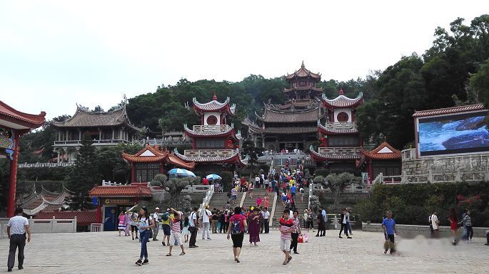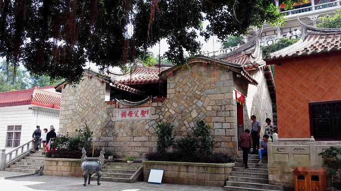 莆田,号蒲仙,因南派少林而名于说部,此技亦久湮不传矣,今之兴者,唯湄洲岛上之妈祖祖庙也。登湄洲需于文甲码头买舟,由城厢南行约百里才及,而岛陆之间甚狭,舟行片刻耳。岛上石岩嶙嶙,有宫宇踞石间,此妈祖庙也。妈祖者,传为宋初林氏民女,即湄洲湾人,年少而殁,传言庇佑海疆,得渔人崇信,历朝累有封褒,由“夫人”而“妃”而至“天妃”、“天后”,允为天上圣母矣,湄洲岛上之妈祖庙即宋雍熙四年之初建者,而为四海后继之祖也。惜历年毁损,古迹难存,所溯最古者,或及清初。谒圣父母殿时,遇富户演剧酬神,众扮八仙祝寿形貌,作于殿前檐下,亦是热闹一场。祖庙之正殿原称“朝天阁”,乃永乐初郑和奉旨所建,康熙间太子太保姚启圣重修此殿,加重檐歇山顶,面阔三间,改作正殿,俗以姚氏官称首二字“太子”呼之,实未有某太子及此也;殿后依山势而起高阁,乃靖海侯施琅重修之朝天阁,阁内悬妈祖天妃画影一轴,即台湾鹿港天后宫所进之“黑脸妈祖”也。同行李君素虔神佛,祝祷进香后得佑护平安之小令旗一面,他处未见,叹为新奇。拜谒毕,搭岛内之公车趋南端之沙滩,车行甚久,湄洲岛上聚数个村厝,非若鼓浪屿之弹丸之地也。沙滩之沙土颇幼细,而海水不佳,此时天气亦转凉,不宜下水矣,听数声海涛而返。