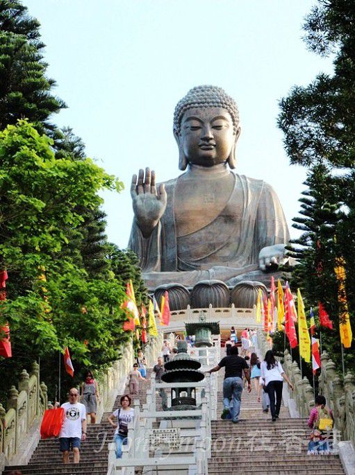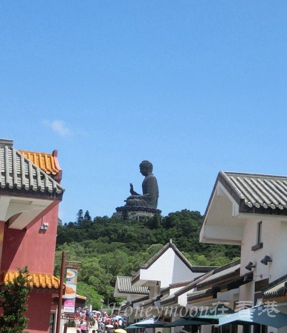 沿途的景色怡人,不仅可以看到大屿山的自然风光、远眺南中国海、还可以看到香港国际机场呢,一饱眼福了!缆车的终点便是“昂坪市集”,宏伟的天坛大佛及宝莲禅寺也在眼前。