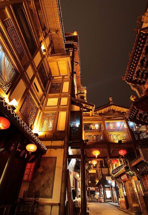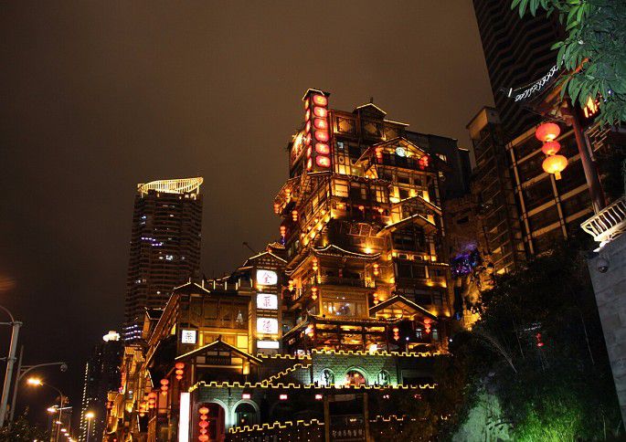 从洪崖洞外面看根本看不出这一共有十一层,夜晚的洪崖洞灯光亮起来,让我想起了千与千寻的场景,完全符合山城重庆的感觉!在洪崖洞还有一个小吃街,卖各种小吃,当然也有全聚德,火锅之类的饭店。随便找了一家店要了一晚抄手,麻辣真的很爽口!吃过饭之后又拍了点夜景就回酒店休息了