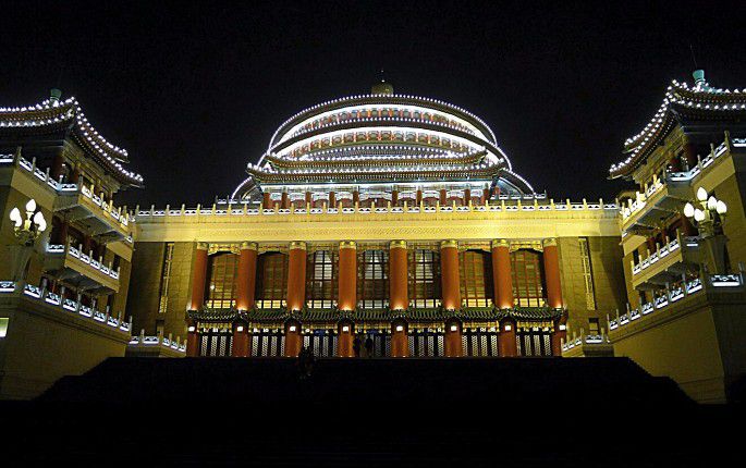 大礼堂边上是重庆人民广场,一边高楼遍布,另一边是嘉陵江。这就是重庆人民大礼堂。远看像天坛的样子,特别宏伟。非常适合照相!尤其是晚上灯光亮起来之后更加好看~