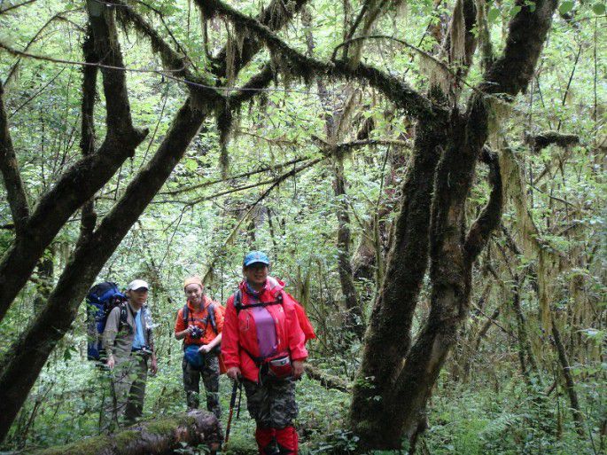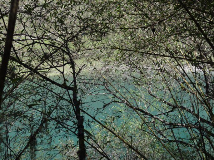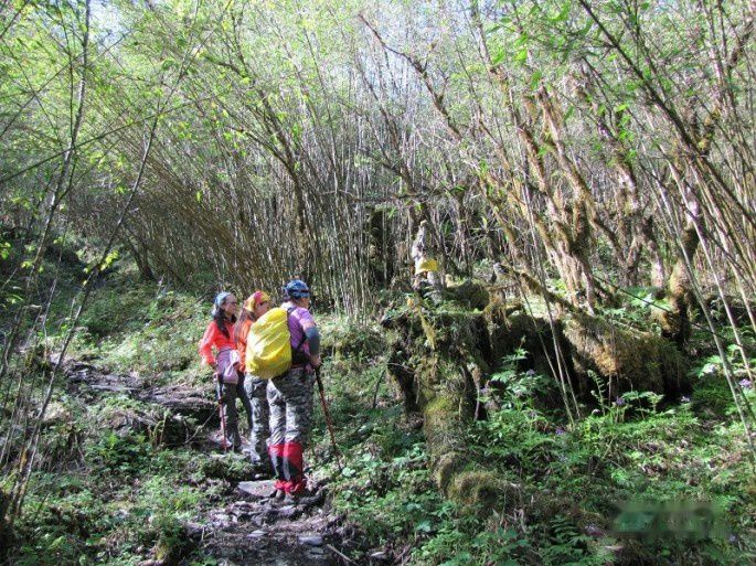 到了草甸,我们听到水声,绿海子就在下面,我们却在成千亩的绿儿久和斑竹的面前找不到下去的路。三妹、我、峰哥,分别找路,在密林中相距几米却看不到彼此,只有用我的哨子来汇集大家。最后,大家终于连滚带爬的冲向了绿海子