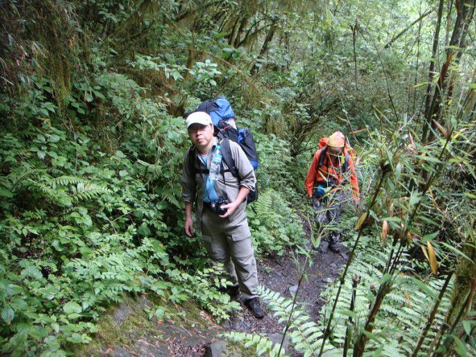 在我们返回的途中峰哥还是有点不心甘,磨磨蹭蹭的走在最后面,建议在河床搭营,明天再走。我和三妹听到这个消息,加快了往回走的速度。河床,在雨季是很不安全的.可是,老天看我们如此诚恳,居然让我们踩到了狗屎运——遇上了三个上山采药的人。